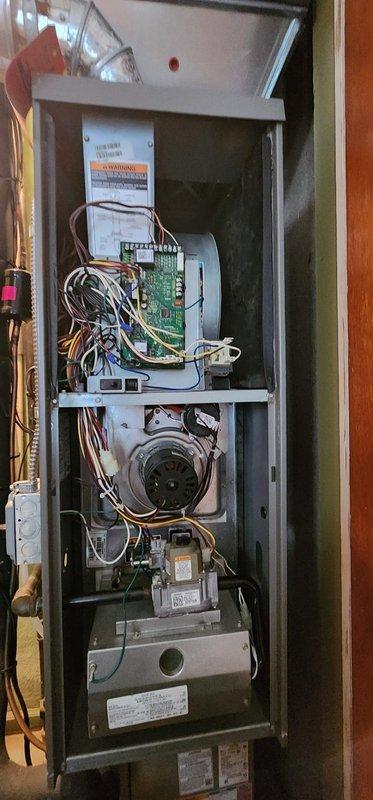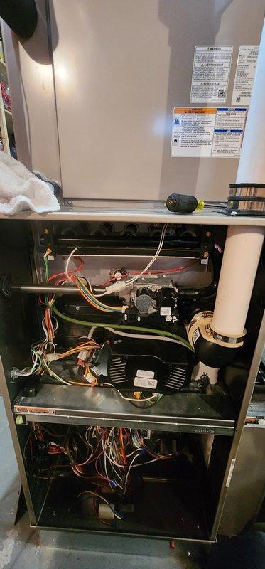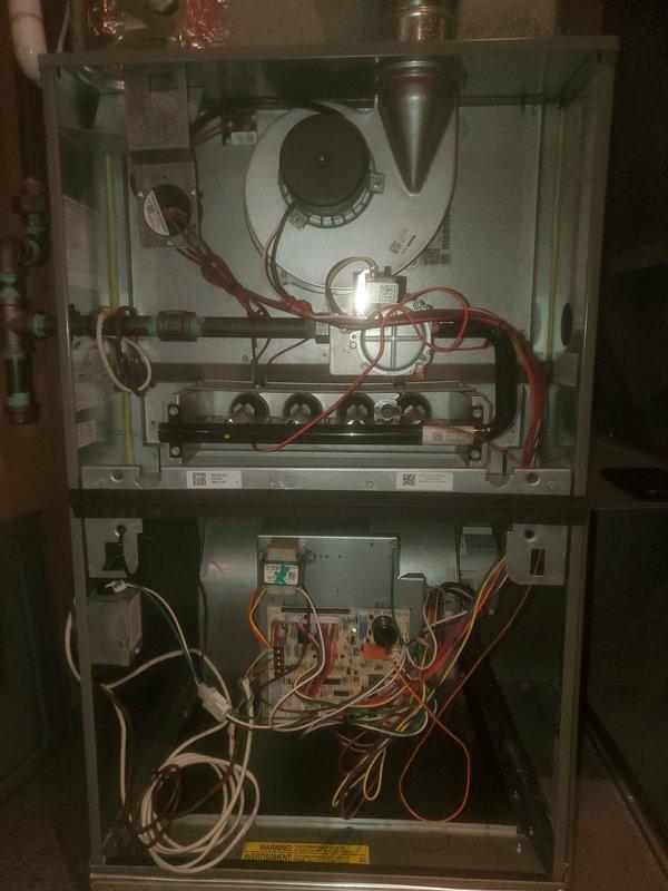 Performed scheduled furnace maintenance service, inspecting heat exchanger assembly, blower motor, and exhaust components. Examined control board connections and wiring integrity throughout system. All components functioning properly with no issues detected.