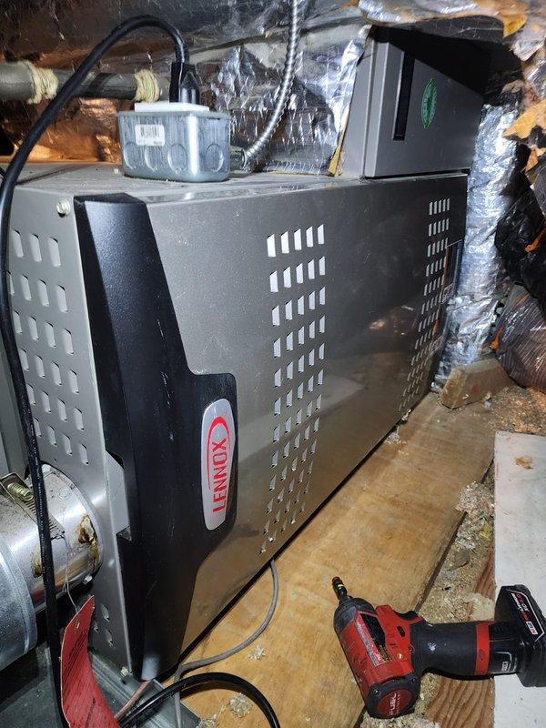 Successfully installed a complete Lennox HVAC system, including a new furnace, air conditioner, and S40 thermostat. The outdoor unit was properly mounted on a concrete pad with all necessary electrical connections and refrigerant lines installed according to manufacturer specifications. System was tested and confirmed to be operating at optimal performance levels.