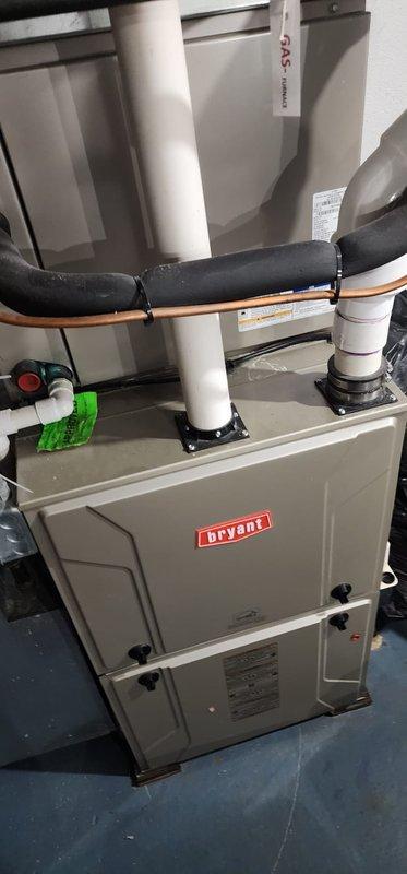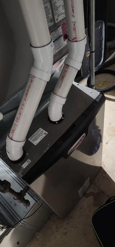 Successfully installed new Lennox furnace and S40 thermostat in unfinished basement area. Installation included proper connection of PVC ventilation pipes with appropriate routing along ceiling joists and installation of condensate drain line. System was fully tested and is operating within manufacturer specifications.