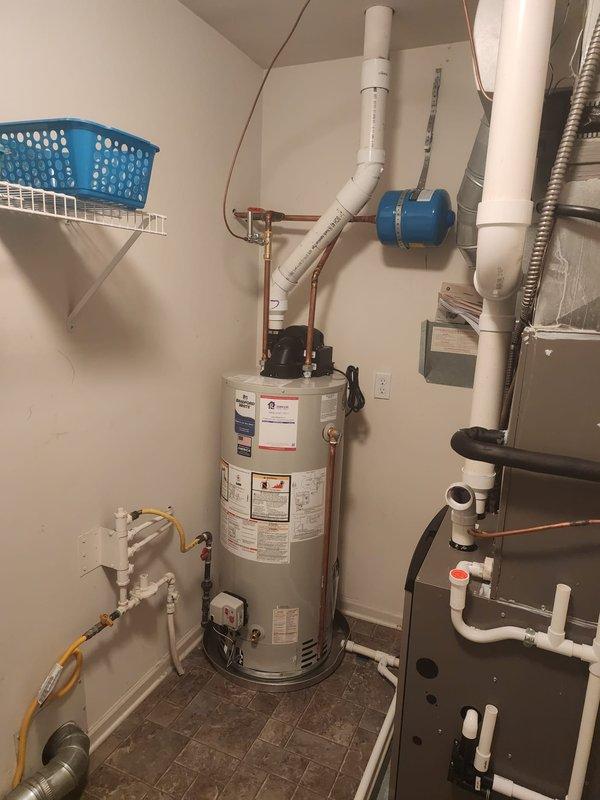 Successfully installed new 40-gallon water heater with proper connections to existing copper and PVC plumbing. Completed installation included connecting yellow flexible gas line, mounting expansion tank, and ensuring all connections were secure and leak-free. Service Finance paperwork was completed and identification verified.