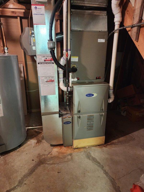 Responded to no-heat service call for Carrier furnace in residential setting. Performed diagnostic inspection of the complete system including connections to water heater and associated PVC venting. Restored heating functionality by cleaning flame sensor and verifying proper ignition sequence, returning system to normal operation.