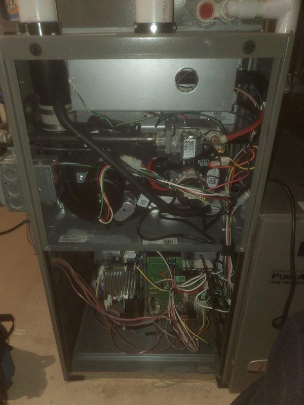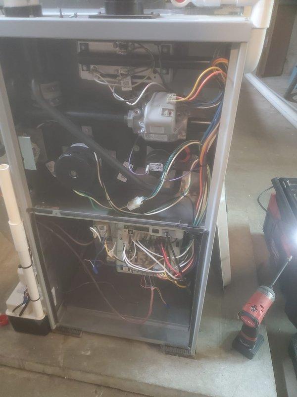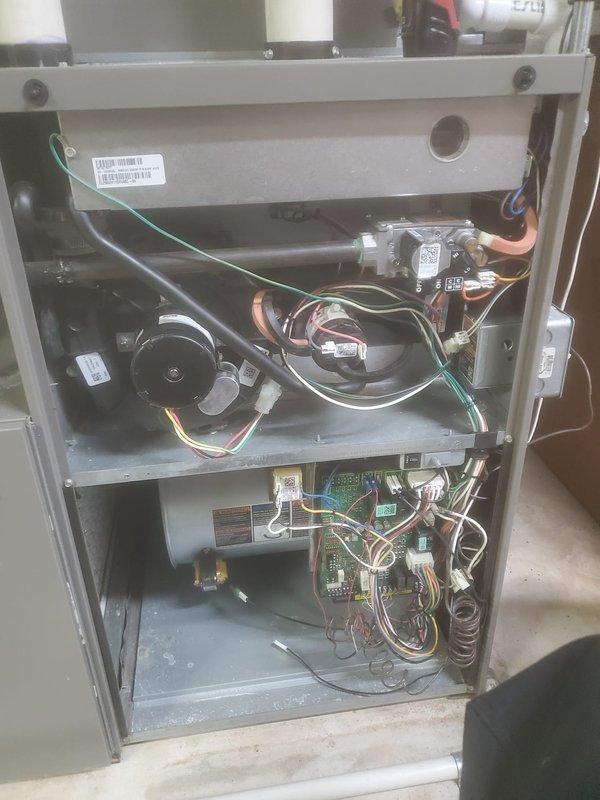 Performed routine furnace maintenance service, including inspection of internal components, wiring connections, and blower motor assembly. Removed front panel to access and evaluate all electrical connections, ensuring proper wire routing and terminal security. System was thoroughly examined and restored to proper operating condition with all panels securely reinstalled.