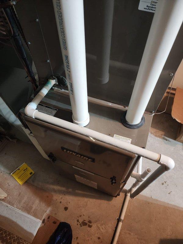 Performed scheduled maintenance on Luxaire furnace in basement utility area. Inspected complete system including PVC intake/exhaust venting, checked all connections and components for proper operation. No issues identified during service; system is functioning within normal parameters.