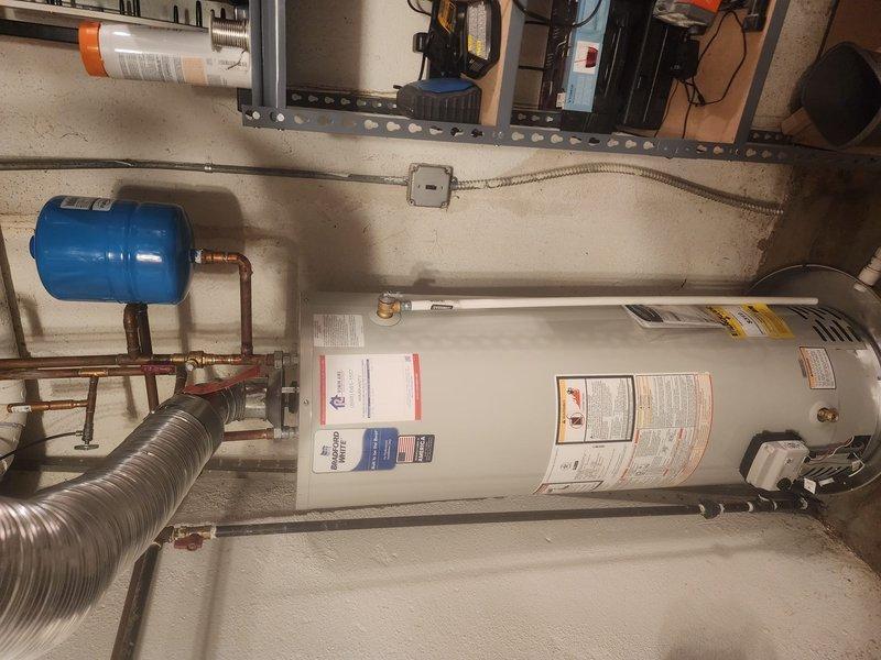 Completed installation of residential tanked water heater in basement utility room. Unit was properly positioned, connected to existing copper supply and discharge lines, and integrated with pressure tank system. All plumbing connections were secured, unit was tested for proper operation, and installation meets code requirements.