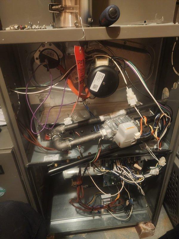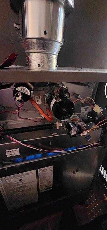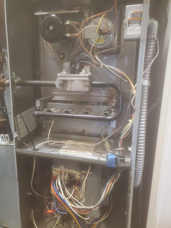 Completed scheduled furnace maintenance on residential heating system. Performed comprehensive inspection of all mechanical and electrical components, including blower motor assembly, heat exchanger, pressure switches, and control board. Verified proper operation of safety controls, checked all electrical connections for secure mounting, and inspected gas piping and fittings. System tested and confirmed operating within manufacturer specifications.