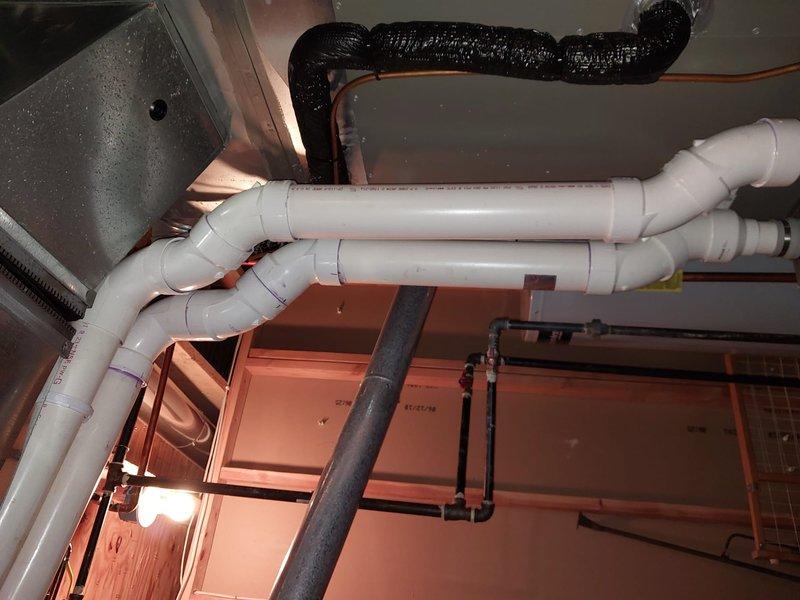 Performed scheduled maintenance on Lennox air handler system (FRN Maint 10-12). Inspected unit mounted in basement area, verified proper installation of condensate drain system with PVC piping and connections. System appears to be operating within normal parameters with no visible damage or anomalies detected.