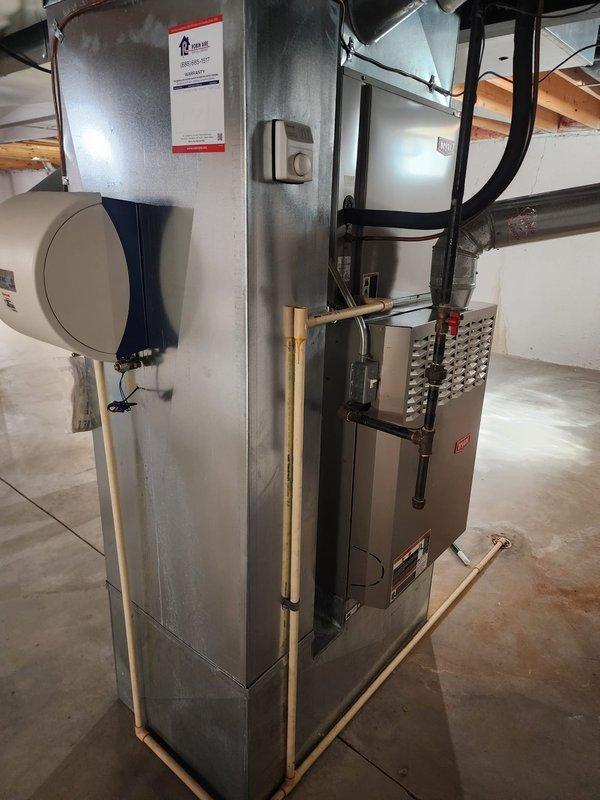 Successfully completed installation of dual Lennox furnaces with S40 thermostats and humidifiers in basement utility area. All units were properly mounted on concrete floor with PVC ventilation pipes correctly routed, and all connections to existing ductwork were secured. System was tested and verified operational with proper documentation completed.