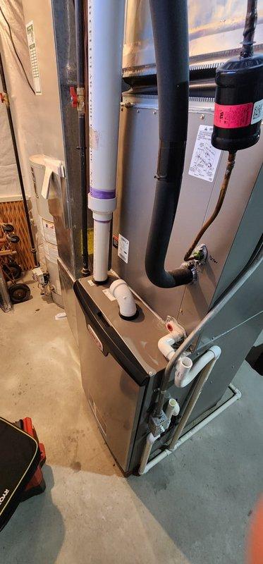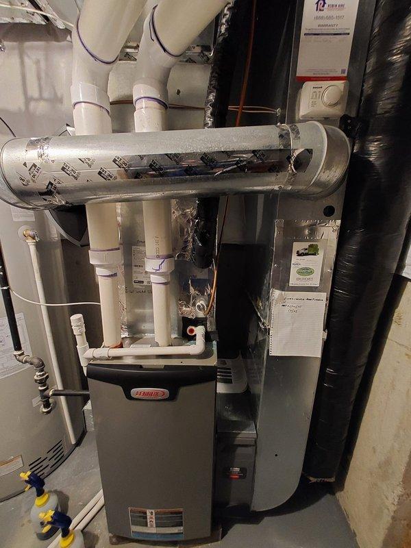 Successfully installed a new Lennox furnace unit with associated ductwork in the basement utility room, connecting all necessary PVC venting and condensate lines. Completed installation of S40 thermostat and verified proper system operation with all connections secure and system functioning to manufacturer specifications.