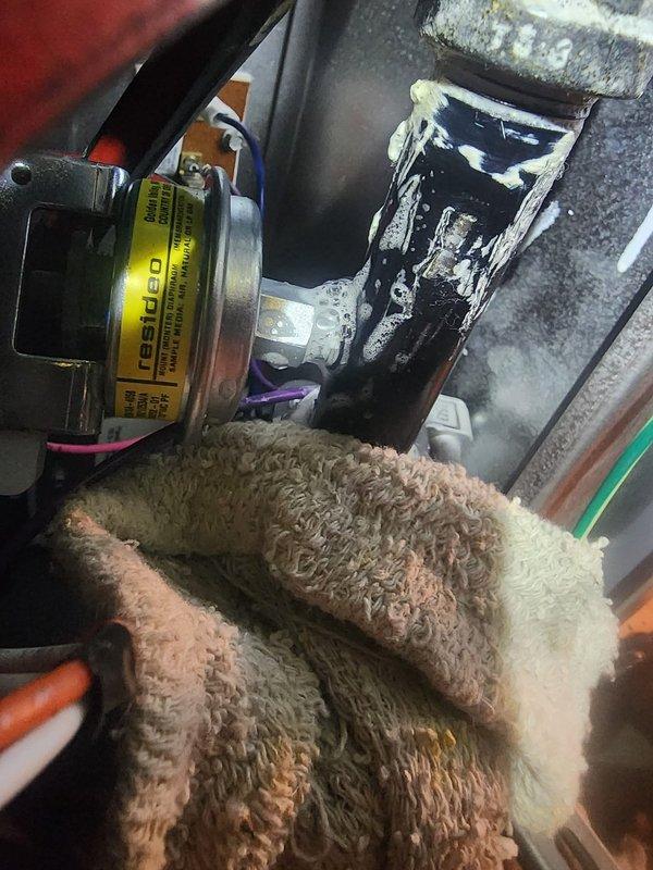 Responded to service call for newly installed furnace showing signs of plumbing connection issues. Identified deteriorated pipe seal with significant mineral buildup/corrosion at connection point. Cleaned affected area and replaced faulty resistol control gauge that showed improper wiring connections (pink/purple wires) to restore proper system functionality.