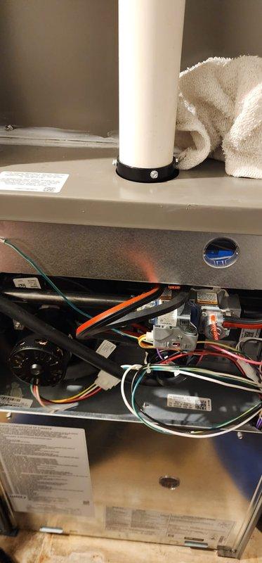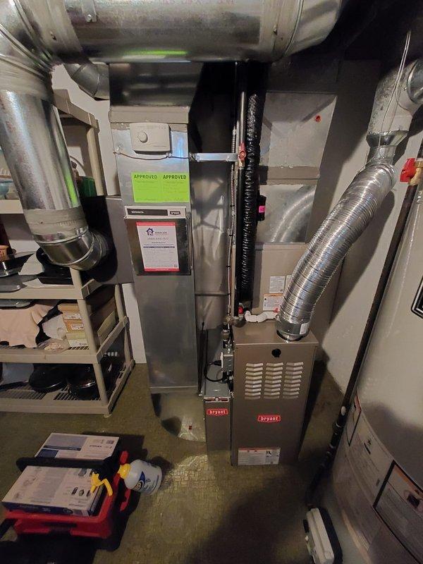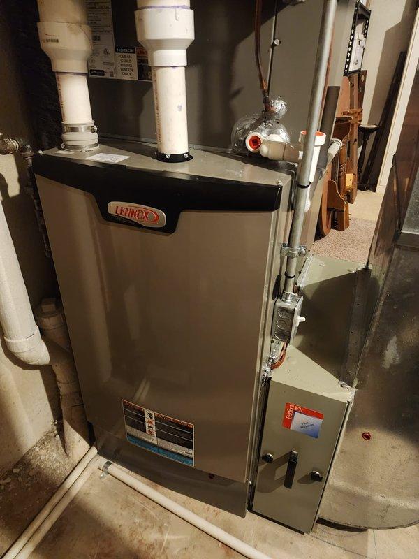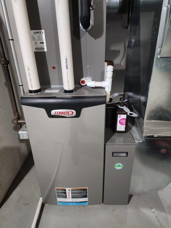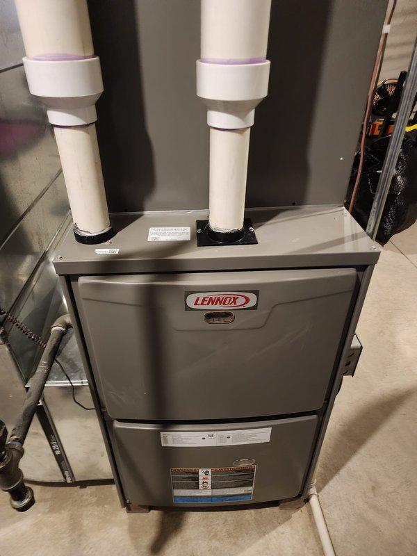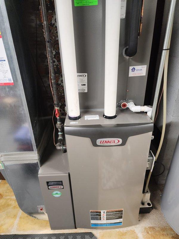 Performed routine maintenance on Lennox furnace system. Inspected main unit and auxiliary components, checked exhaust/intake pipes, and verified proper drainage through the PVC system. All systems operating within normal parameters.