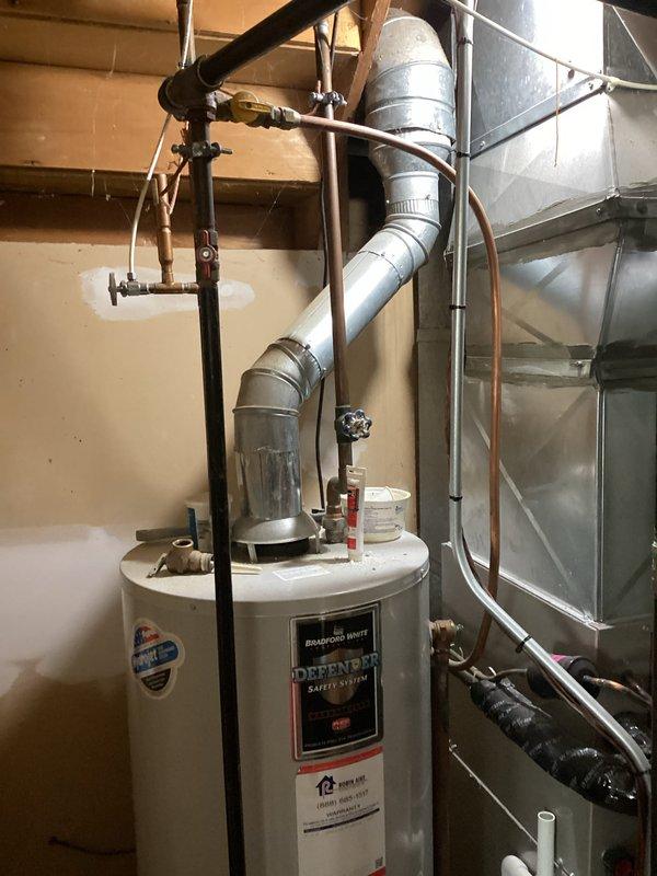 Successfully installed a 50-gallon water heater in basement mechanical room, including proper connections to existing copper plumbing and drain line to floor drain. Installation included mounting of expansion tank and testing of all connections to ensure proper operation and no leaks.