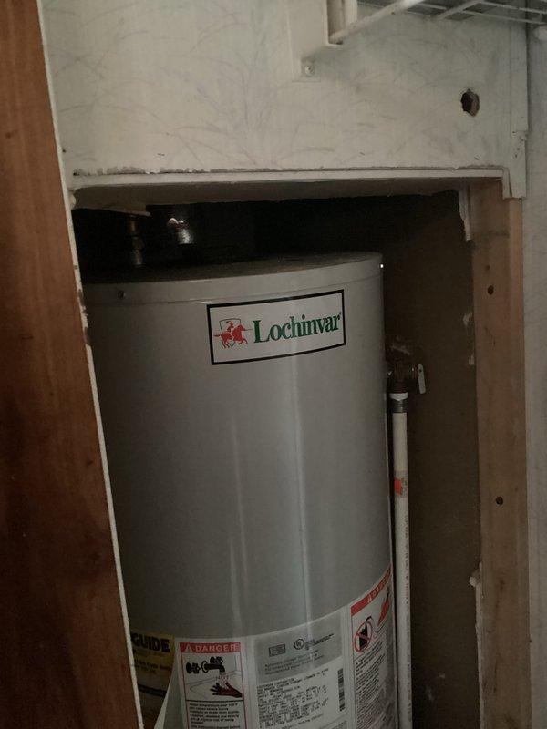 Conducted assessment of existing Lochinvar water heater for replacement estimate. Unit is installed in utility alcove with partially finished wall enclosure and standard plumbing connections. Customer reports no water and requires urgent replacement. Documented current installation configuration to prepare comprehensive replacement proposal.