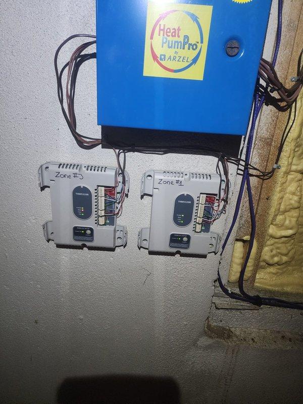 Conducted site visit to evaluate customer's request for relocation of multiple thermostats. Inspected existing Heat PumPro by ARZEL zoning system with particular attention to Zone #1 and Zone #5 control modules. Documented current installation configuration and wiring connections to determine feasibility of requested modifications.