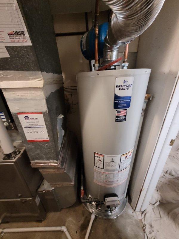 Successfully installed a 40-gallon Bradford White tanked water heater in the residential utility area, complete with proper copper pipe connections and venting system. All plumbing connections were secured with appropriate valves, and the unit was tested for proper operation before completion.