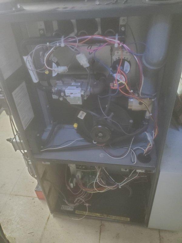 Performed scheduled furnace maintenance with front panel removed to inspect internal components. Examined electrical connections, wiring integrity, and blower motor assembly. Completed manufacturer rebate-eligible tune-up with comprehensive system inspection and documentation via service photos.