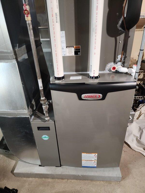 Performed scheduled maintenance on two Lennox furnace systems located in the basement. Inspected all components including PVC intake/exhaust venting, copper refrigerant lines with insulation, condensate drainage system with clean-out access, and verified proper connection to existing ductwork. Both units were confirmed to be in good working condition with no visible damage or required repairs.