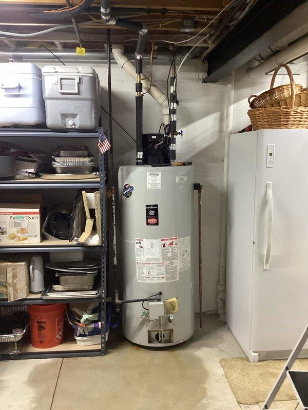 Conducted inspection of 25-year-old water heater located in walk-out basement. Assessed unit, connections, and surrounding area for replacement estimate. Current installation includes standard vertical tank with top connections, positioned between storage shelving and upright freezer, with adequate access to plumbing and electrical infrastructure.