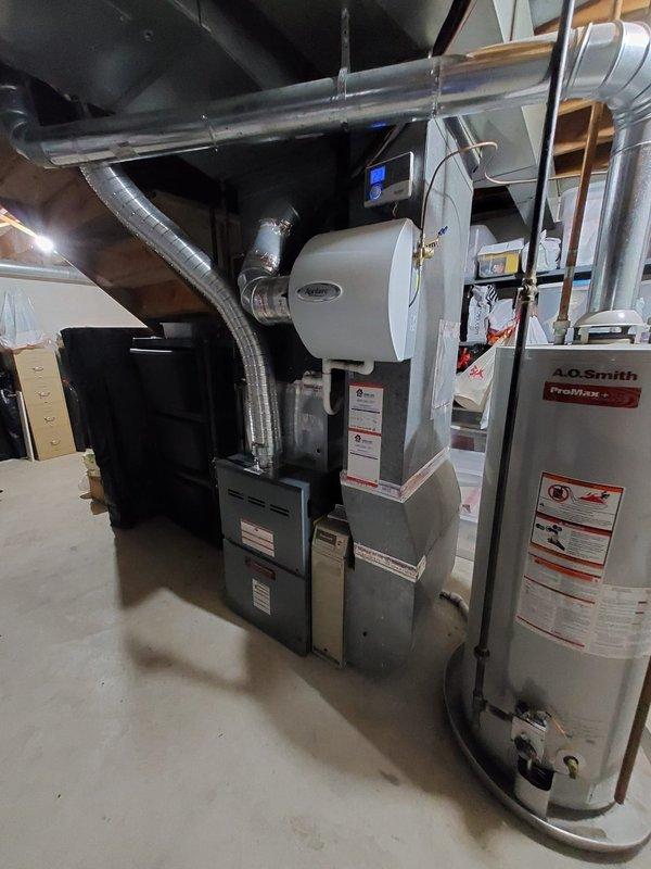 Completed routine preventative maintenance on FRN system under Worry Free Service Agreement. Inspected furnace, ductwork, and humidifier in basement utility area; all components functioning properly with no visible issues. System includes A.O. Smith ProMax water heater and ceiling-mounted ductwork - documentation provided through service photos.