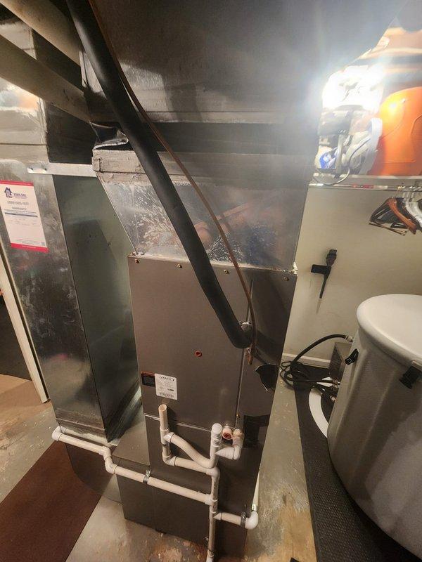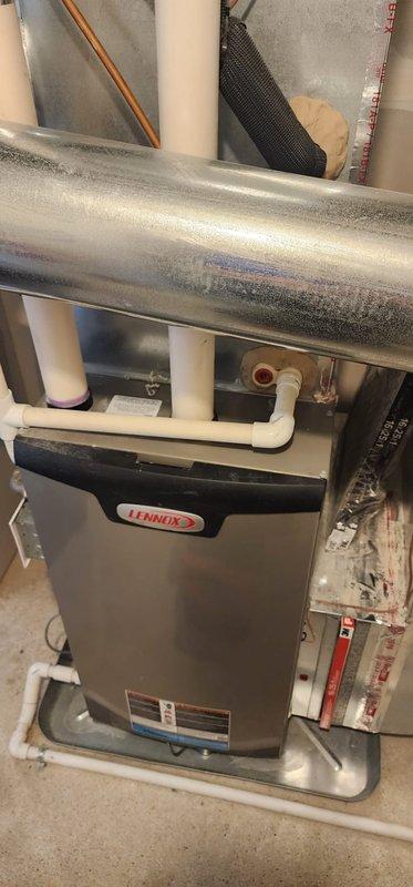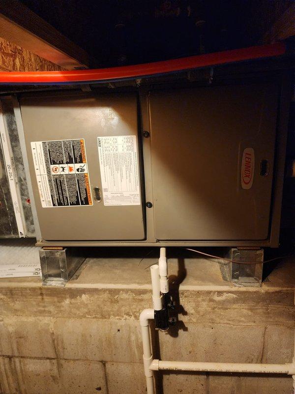 Performed scheduled maintenance on Lennox air handler system (FRN Maint 10-12). Inspected unit mounted in basement area, verified proper installation of condensate drain system with PVC piping and connections. System appears to be operating within normal parameters with no visible damage or anomalies detected.