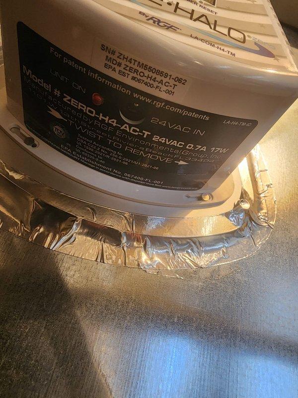 Successfully replaced existing air purification system with a new REME HALO unit (model ZERO-HAL AC-T) in customer's HVAC system. Installation included proper mounting, electrical connections (24VAC input), and verification of operation as confirmed by power indicator light.