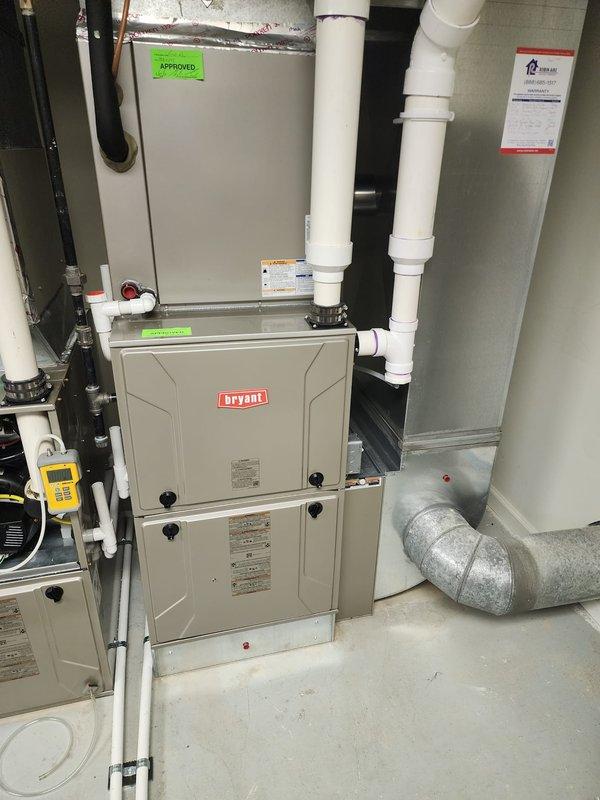 Completed scheduled maintenance service on two residential HVAC systems: a standard furnace unit installed in a utility area with PVC ventilation pipes and flexible insulated ducting, and a Bryant dual-cabinet system with proper ventilation connections. Both systems were inspected, cleaned, and tested according to manufacturer specifications, ensuring optimal heating performance for the upcoming season.