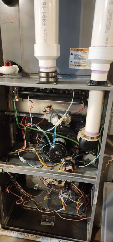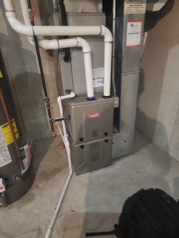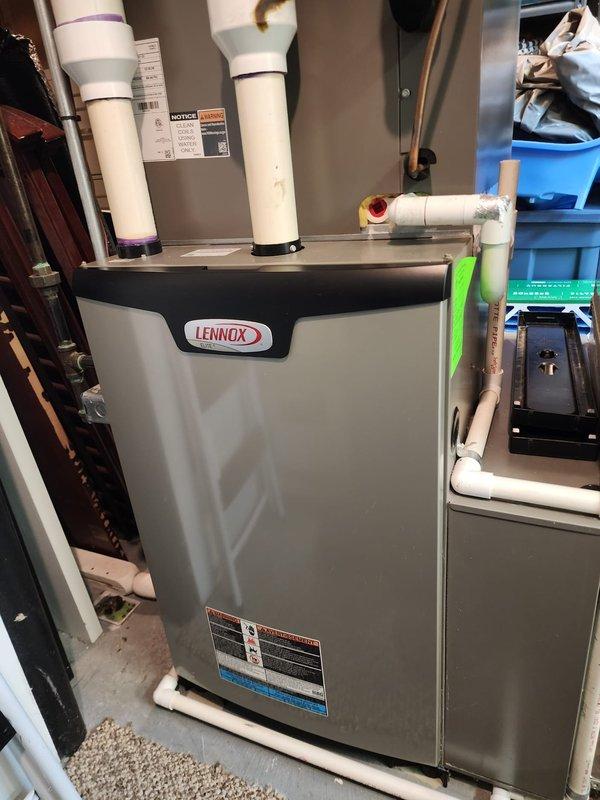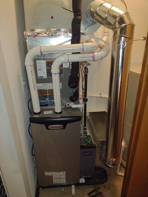 Successfully installed complete HVAC system including new Lennox furnace, air conditioner, and Ecobee6 smart thermostat. System installation included proper connection of condensate drain lines, ductwork integration, and verification of all electrical connections. Final inspection confirmed proper operation of all components with filter properly installed.