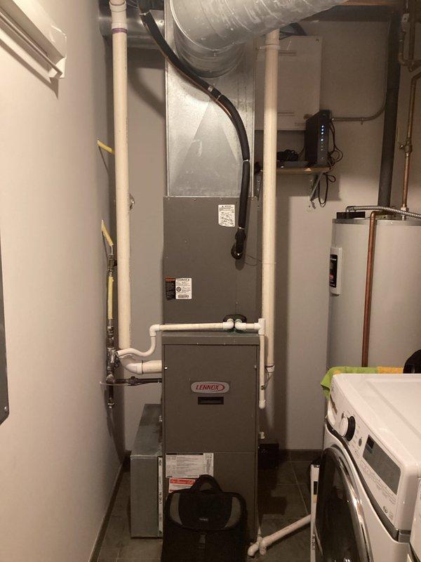 Conducted HVAC replacement estimate for existing Lennox furnace system in utility room. Evaluated current installation including ductwork, PVC venting, and integration with other mechanical systems. Photos documented the current equipment configuration for accurate replacement proposal.