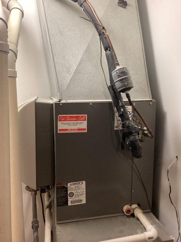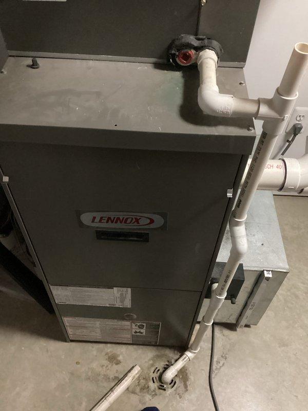 Conducted HVAC replacement estimate for a Lennox furnace system. Documented existing unit configuration including PVC condensate drainage, refrigerant lines, and electrical connections. System appears to be in functional condition with all components intact.