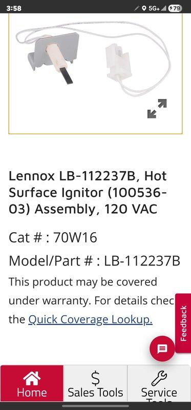 Responded to callback for unit displaying error code 207 with 5-9 indicator. Diagnosed faulty hot surface ignitor (Lennox LB-112237B, 120 VAC, part #100536-03). Replaced ignitor assembly (catalog #70W16) and verified proper system operation.