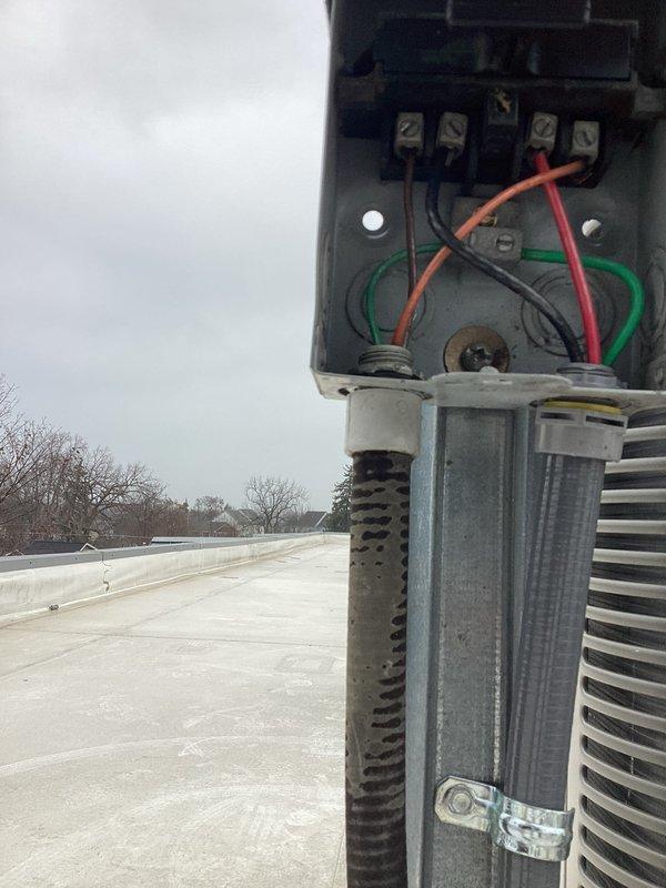 Responded to call back regarding undersized breaker for rooftop HVAC unit. Inspected electrical junction box and confirmed unit requires 25-35 amps per nameplate but was connected to 20 amp breaker. Evaluated wiring and documented condition of electrical connections with photos for proper resolution.