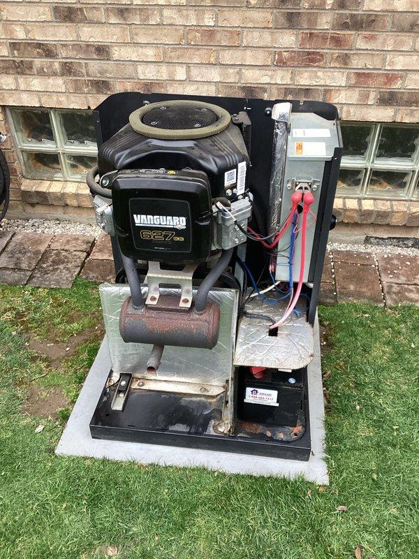 Performed scheduled maintenance on outdoor Vanguard 627cc generator. Completed full service including inspection of electrical connections, fuel system check, and evaluation of exhaust components. Unit shows normal weathering but is functioning properly after service.