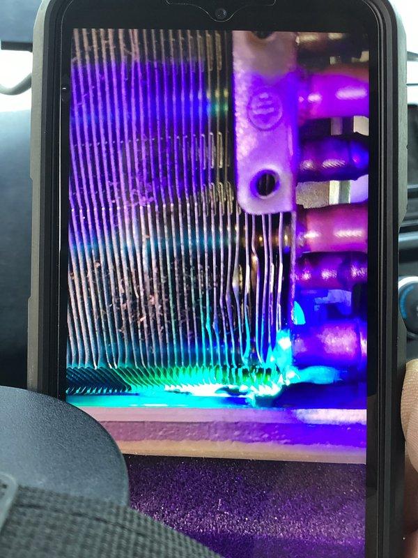 Diagnosed mini split heating performance issue by conducting UV leak detection inspection of the evaporator coil and refrigerant lines. Identified buildup on the heat exchanger fins that was affecting thermal transfer efficiency. Performed necessary service to restore proper heating function.